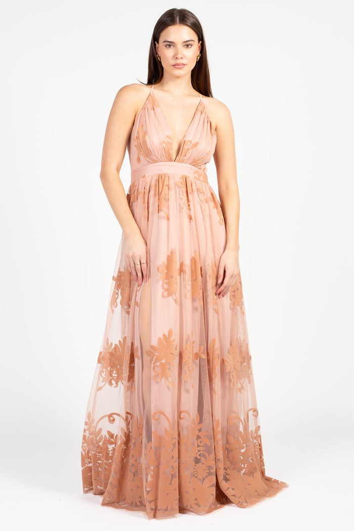 Venetia Rhinestone Trim Slit Midi Dress - honey