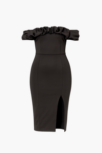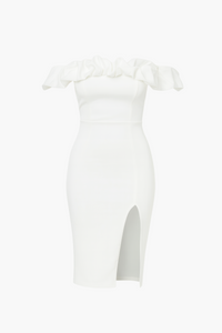 Be the best dressed at any formal occasion in the Coralie Off The Shoulder Ruffle Trim Midi Dress! Medium-weight stretch woven fabric creates a gorgeous off-the-shoulder neckline with statement ruffles. The princess-seamed bodice falls into a figure-hugging silhouette that ends in a mini length hem with side slit.