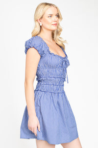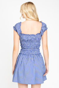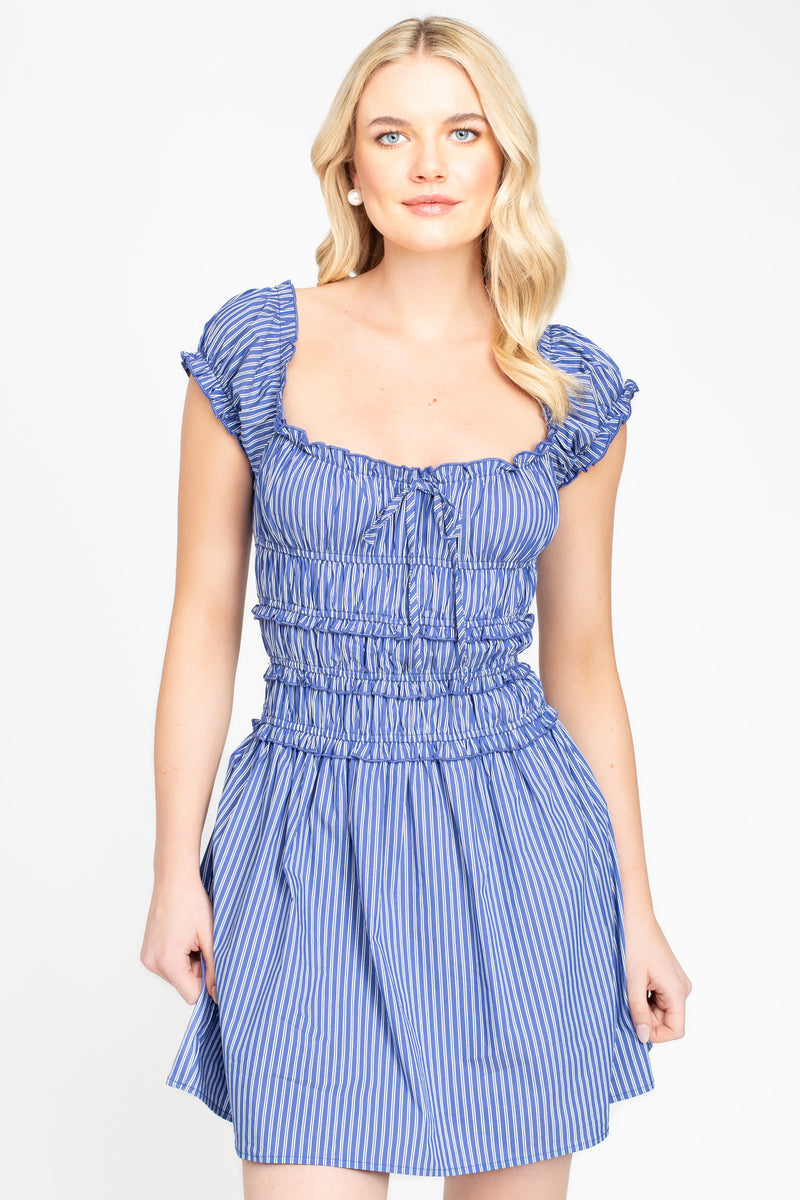 Effortlessly chic and feminine, the Sadie Ruched Mini Dress is perfect for sunny days and casual outings. Featuring ruched detailing that flatters your figure, this dress offers a comfortable yet stylish fit. The capped puff sleeves and striped pattern add a playful, romantic touch, while the flowy fit creates a breezy, flattering silhouette. Ideal for day trips, brunches, or weekend strolls, this dress combines comfort with an elevated style.