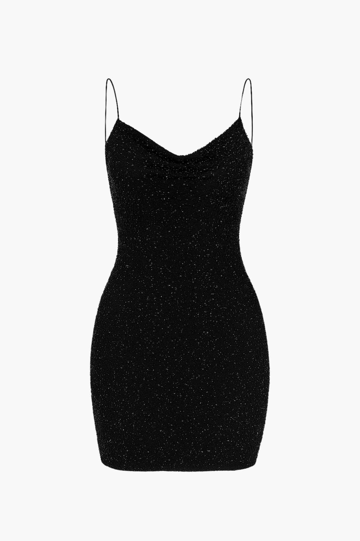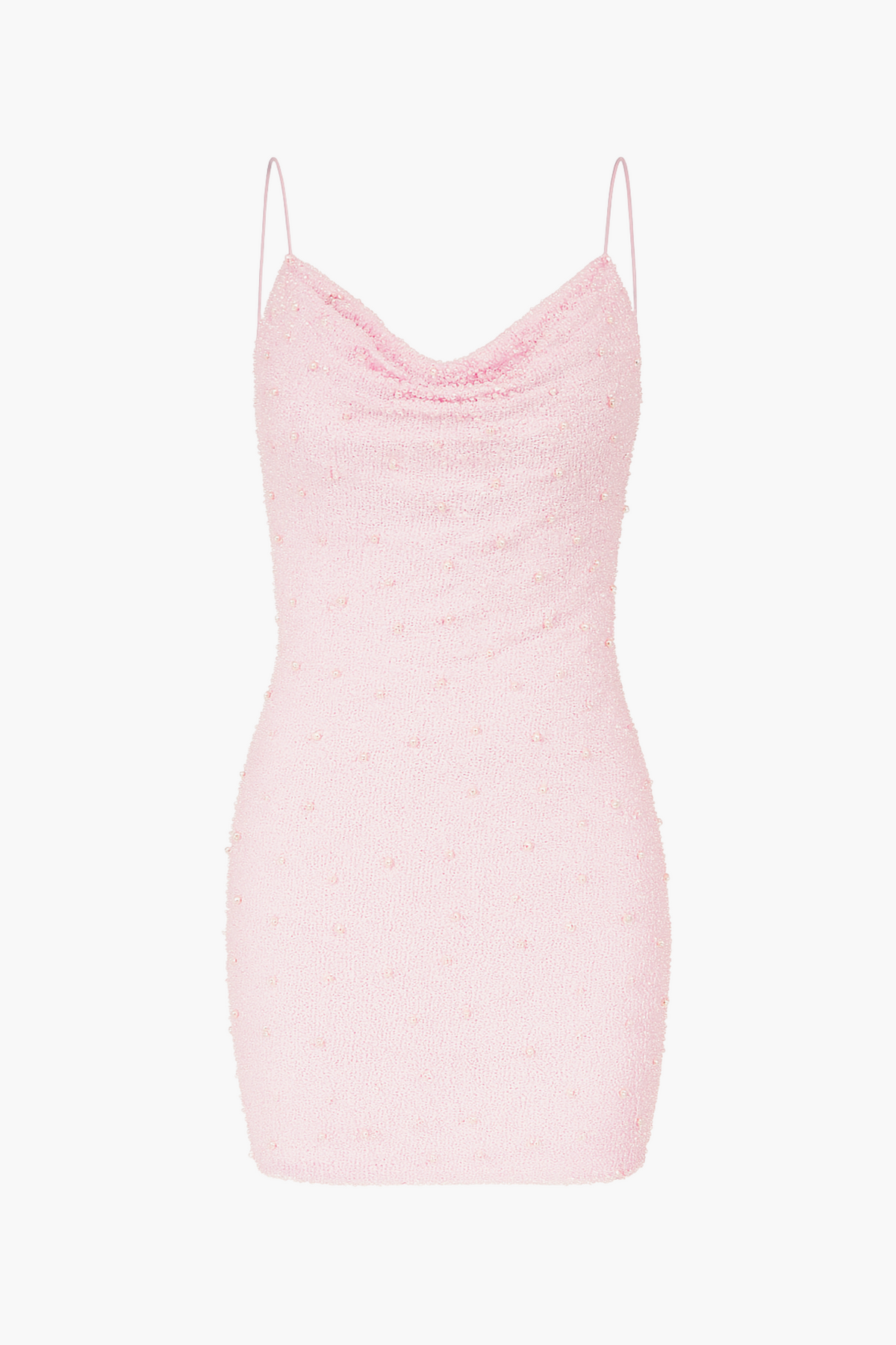 Turn heads with our pearl beaded embellished mini dress. Designed for those that seek the spotlight, this dress begins with a captivating drape neckline framed by dainty spaghetti straps. Stunning beads and pearl embellishments elevate this bodycon silhouette. The show stopping details continue at centre back displaying an intricate corset allowing for a customizable fit.
