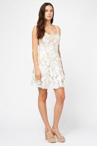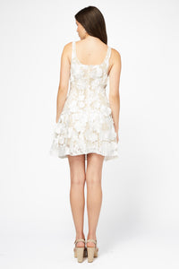This enchanting white dress is a dreamy blend of romance and flirtation! Adorned with intricate floral lace appliqués, it exudes a delicate and ethereal charm. The sleeveless design and flowy A-line silhouette make it perfect for twirling, while the sheer overlay adds a touch of allure.